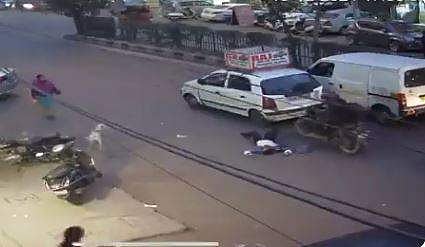 അതിവേഗത്തിൽ സ്കൂട്ടർ വളവ് തിരിഞ്ഞെത്തുന്നതാണ് ദൃശ്യത്തിലുള്ളത്. പിൻസീറ്റിലിരുന്നയാൾ ഒരാളെ പിടിച്ചിരിക്കുന്നതും വലിച്ചിഴയ്ക്കുന്നതും കാണാം. വളവ് തിരിഞ്ഞ് പ്രധാന റോഡിലെത്തിയപ്പോൾ ഇയാൾ കൈവിട്ടതോടെ സ്ത്രീ തലയടിച്ചു റോഡിന് നടുവിൽ വീഴുന്നതും ദൃശ്യങ്ങളിലുണ്ട്. ചുറ്റുമുള്ള ആളുകൾ ഒന്ന് അമ്പരന്നെങ്കിലും പിന്നീട് റോഡിൽ വീണ സ്ത്രീയെ പിടിച്ചു മാറ്റുന്നതും വീഡിയോയിൽ കാണാം.