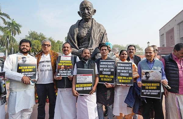 തൃണമൂല് കോണ്ഗ്രസ് എംപി ഡെറിക് ഒബ്രിയനെ വ്യാഴാഴ്ച രാജ്യസഭയില് നിന്നും കോണ്ഗ്രസിലെ ഒമ്പത് പേരും ഡിഎംകെയുടെ കനിമൊഴിയും ഉള്പ്പെടെ 13 പ്രതിപക്ഷ എംപിമാരെ ലോക്സഭയില് നിന്നും സസ്പെന്ഡ് ചെയ്തു.നിശബ്ദ വിപ്ലവം എന്നെഴുതിയ ടീ ഷര്ട്ട് ധരിച്ചാണ് ഒബ്രിയാന് പ്രകടനത്തില് പങ്കെടുത്തത്. മുന് കോണ്ഗ്രസ് അധ്യക്ഷ സോണിയ ഗാന്ധിയും ഇവര്ക്കൊപ്പം പ്രകടനത്തില് അണിനിരന്നു. പാര്ലമെന്റില് നുഴഞ്ഞുകയറിയവര്ക്ക് സന്ദര്ശക പാസ് നല്കിയ ബിജെപി എംപിയ്ക്കെതിരെ കര്ശന നടപടി വേണമെന്നും തങ്ങള്ക്കെതിരായ സസ്പെന്ഷന് പിന്വലിക്കണമെന്നും പ്രതിഷേധിച്ച എംപിമാര് ആവശ്യപ്പെട്ടു.