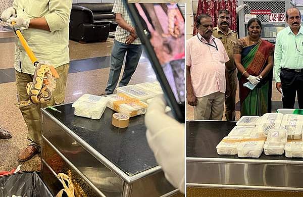 ട്രിച്ചി വിമാനത്താവളത്തിലെത്തിയ യാത്രക്കാരനെ കണ്ട് സംശയം തോന്നിയ കസ്റ്റംസ് ഉദ്യോഗസ്ഥര് മൊയ്തീനെ തടഞ്ഞ് ബാഗ് പരിശോധിക്കുകയായിരുന്നു. ബാഗുകളിലെ പ്രത്യേകം അറകളില് വിവിധ ഇനങ്ങളിലും വലിപ്പത്തിലമുള്ള പാമ്പുകളെ പെട്ടികളില് ഒളിപ്പിച്ച നിലയില് കണ്ടെത്തി.