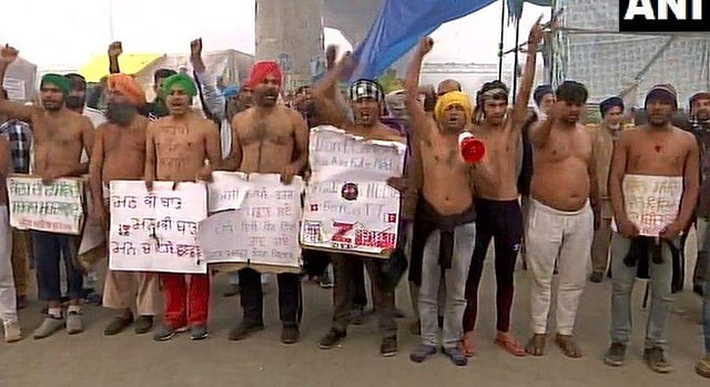 ടിക്കിങ് അതിര്ത്തിയില് തമ്പടിച്ച കര്ഷകര് മേല്വസ്ത്രം ഊരി, ദേഹത്ത് പ്രതിഷേധം രേഖപ്പെടുത്തിയാണ് സമരത്തില് അണിനിരന്നത്. പ്ലക്കാര്ഡുകളും പോസ്റ്ററും പിടിച്ച് ഇവര് കേന്ദ്രസര്ക്കാരിന്റെ നിയമങ്ങള്ക്കെതിരെ മുദ്രാവാക്യം മുഴക്കി പ്രതിഷേധിച്ചു.