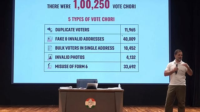 വീട്ടു നമ്പര് പല വോട്ടര്മാര്ക്കുമില്ലെന്ന് രാഹുല് പറഞ്ഞു. പലതിലും വീട്ടു നമ്പര് പൂജ്യമെന്നാണ് വോട്ടര് പട്ടികയിലുള്ളത്. 80 പേരുള്ള കുടുംബം ഒരു മുറിയില് കഴിയുന്നതായി വോട്ടര് പട്ടികയിലെ വിലാസത്തിലുണ്ട്. മറ്റൊരു മുറിയില് 46 പേര് കഴിയുന്നതായാണ് രേഖകള്. പരിശോധിച്ചപ്പോള് ഇവിടെയെങ്ങും ആളുകളെ കണ്ടെത്താനായില്ല. ആര്ക്കും ഇവരെ അറിയില്ല. 40,009 തെറ്റായ മേല്വിലാസങ്ങള് കോണ്ഗ്രസ് അന്വേഷണത്തില് കണ്ടെത്തി. ഒരു വിലാസത്തില് മാത്രം 10,452 വോട്ടര്മാര് ഉണ്ട്. തെരഞ്ഞെടുപ്പ് കമ്മിഷന്റെ ചില പട്ടികകളില് വോട്ടര്മാരുടെ ഫോട്ടോ ഇല്ല. വളരെ ചെറിയ രീതിയില്, തിരിച്ചറിയാനാകാതെ ഫോട്ടോ കൊടുത്ത ലിസ്റ്റുകളുമുണ്ട്. 33,000 പേര് ഒരു മണ്ഡലത്തില് രണ്ടുതവണ വോട്ട് ചെയ്തു. 68 പേര്ക്ക് വോട്ട് ബിയര് പാര്ലറിന്റെ വിലാസത്തിലാണെന്നും രാഹുല് പറഞ്ഞു.