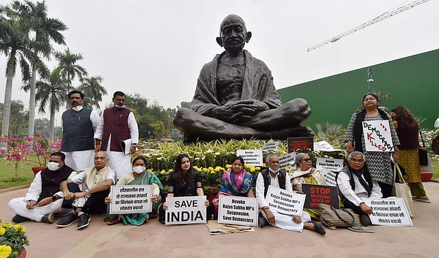 കാര്ഷിക നിയമങ്ങള് ഉള്പ്പെടെയുള്ള വിവിധ വിഷയങ്ങളില് കഴിഞ്ഞ സമ്മേളന കാലയളവില് പ്രതിഷേധം നടത്തിയതിനാണ് കേരളത്തില് നിന്നള്ള എംപിമാര് അടക്കം പന്ത്രണ്ട് രാജ്യസഭാ അംഗങ്ങളെ തിങ്കളാഴ്ച സസ്പെന്റ് ചെയ്തത്. ശൈത്യകാല സമ്മേളനം അവസാനിക്കുന്നതുവരെയാണ് സസ്പെന്ഷന്.മാപ്പുപറയാന് തങ്ങള് സവര്ക്കര് അല്ലെന്ന് കഴിഞ്ഞദിവസം സിപിഐ എംപി ബിനോയ് വിശ്വം പറഞ്ഞിരുന്നു.