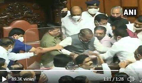 75 അംഗ കര്ണാടക ലെജിസ്ലേറ്റീവ് കൗണ്സിലിന്റെ ചെയര്മാനായ കോണ്ഗ്രസ് അംഗം പ്രതാപ് ചന്ദ്ര ഷെട്ടിക്കെതിരായ അവിശ്വാസ പ്രമേയം കൊണ്ടുവരാനുള്ള ബിജെപിയുടെ നീക്കത്തിനിടെയാണ് സംഘര്ഷം. അവിശ്വാസം പ്രമേയം പരിഗണിക്കുന്നതിനിടെ ചെയര്മാന് സീറ്റിലിരുന്ന ഡെപ്യൂട്ടി ചെയര്മാന് ജെഡിഎസ് അംഗം ഭോജെഗൗഡയെ കോണ്ഗ്രസ് അംഗങ്ങള് സീറ്റില് നിന്ന് പുറത്താക്കുകയായിരുന്നു. സീറ്റില്നിന്നു ബലം പ്രയോഗിച്ച് പിടിച്ചുവലിച്ചാണ് ഡെപ്യൂട്ടി ചെയര്മാനെ സഭയ്ക്കു പുറത്തെത്തിച്ചത്.