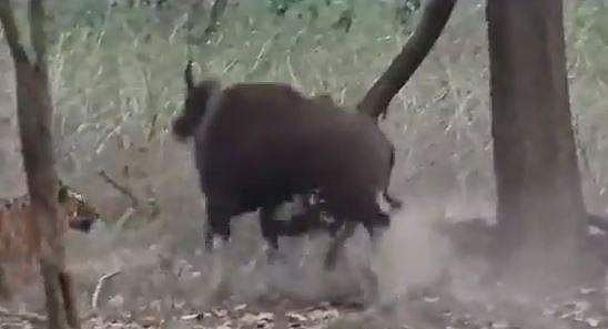 ഇപ്പോള്‍ കടുവയുടെ വായില്‍ അകപ്പെട്ട കാട്ടുപോത്തിനെ രക്ഷിക്കുന്നതിന് പകരം 'പിന്നില്‍ നിന്ന് കുത്തുന്ന' തരത്തിലുള്ള വേറിട്ട വീഡിയോയാണ് വ്യാപകമായി പ്രചരിക്കുന്നത്. രണ്‍ദീപ് ഹൂഡയാണ് വീഡിയോ പങ്കുവെച്ചത്.