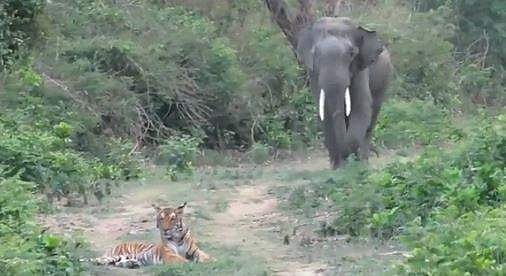 കൊമ്പനാനയുടെ സാന്നിധ്യം മനസിലാക്കി കടുവ കാട്ടിലേക്ക് മറയുന്നതാണ് വീഡിയോയുടെ ഉള്ളടക്കം. കടുവയെ കണ്ടിട്ടും ഒരു കൂസലുമില്ലാതെയാണ് കൊമ്പനാനയുടെ നടത്തം.