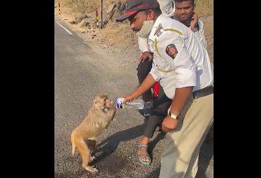 സഞ്ജയ് ഗൂഡെ എന്ന പൊലീസ് ഉദ്യോഗസ്ഥനെയാണ് വിഡിയോയിൽ കാണുന്നത്. ഇദ്ദേഹം കുരങ്ങന് കുപ്പിയിൽ വെള്ളം കുടിക്കാൻ നൽകുന്നത് വിഡിയോയിൽ കാണാം. സമീപത്തുണ്ടായിരുന്നവരാണ് ഈ ദൃശ്യം മൊബൈലിൽ പകർത്തിയത്.