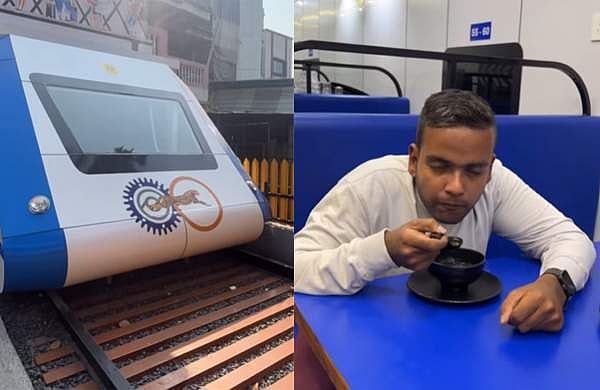 പുറമേ നിന്നും അകമേ നിന്നും തനി വന്ദേ ഭാരത് എക്സ്പ്രസ്. ട്രെയിനിനുള്ളിൽ സീറ്റുകൾ ക്രമീകരിച്ചിരിക്കുന്നതിന് സമാനമായി നീല നിറത്തിലാണ് റെസ്റ്റോറന്റിനുള്ളിലും സീറ്റുകൾ ക്രമീകരിച്ചിരിക്കുന്നത്. രൂപത്തിൽ മാത്രമല്ല റെസ്റ്റോറന്റിന്റെ മെനുവിനും ഉണ്ട് പ്രത്യേകതകൾ.