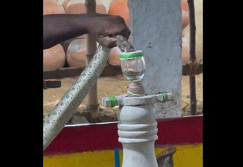 കൈകൊണ്ട് അതിന്റെ കഴുത്തില് പിടിച്ച് ഒരു പാത്രത്തിലേക്ക് അതിന്റെ വിഷം മാറ്റുന്നത് വീഡിയോയില് കാണാം. പാമ്പിനെ വേദനിപ്പിക്കാതെ തന്നെയാണ് ജോലി ചെയ്യുന്നത്.