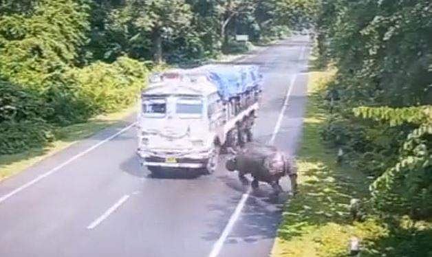 പത്ത് സെക്കന്ഡ് ദൈര്ഘ്യമുള്ള വീഡിയോയില് കാണ്ടാമൃഗം കാട്ടില് നിന്ന് ഓടി വരുമ്പോള് ഒരു ട്രക്കില് ഇടിക്കുന്നു. ഇടിയേറ്റ കാണ്ടാമൃഗം താഴെ വീഴുകയും വീണ്ടും കാട്ടിലേക്ക് ഓടുകയും ചെയ്യുന്നത് വീഡിയോയില് കാണാം.