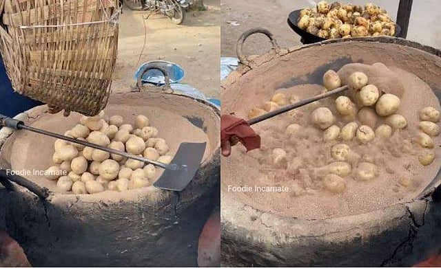 കടലയും കപ്പലണ്ടിയുമൊക്കെ വറുത്തെടുക്കുന്നതുപോലെ ഉരുളക്കിഴങ്ങ് മണ്ണിലിട്ട് വേവിച്ചെടുക്കുന്ന വിഡിയോയാണ് സോഷ്യല് മീഡിയയില് വൈറലാകുന്നത്. ഫുഡ് ബ്ലോഗറായ അമര് സിറോഹി എന്നയാള് ഉത്തര്പ്രദേശിലെ മെയിന്പൂരിയില് എത്തിയപ്പോഴാണ് ഈ വ്യത്യസ്ത രുചി കണ്ടെത്തിയത്. സംഗതി കണ്ടയുടന് വിഡിയോ പകര്ത്തുകയായിരുന്നു കക്ഷി.