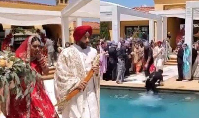 ആഢംഭര റിസോര്ട്ടില് നടന്ന വിവാഹത്തില് വരനും വധുവും എത്തുന്ന രംഗങ്ങള് പകര്ത്തുന്നതിനിടെയാണ് സംഭവം. ഇരുവരും പരമ്പരാഗത വേഷത്തില് അതിഥികളുടെ ഇടയിലേക്ക് നടന്നുവന്നു. ഇവരുടെ രംഗപ്രവേശനം മുന്നില് നിന്ന് ക്യാമറയില് പകര്ത്തുകയായിരുന്ന ഫോട്ടോഗ്രാഫര്. ഒടുവില് കാല്വഴുതി പൂളിലേക്ക് മറിയുകയായിരുന്നു. വെള്ളത്തില് വീണെങ്കിലും കാമറ കൈയില് നിന്ന് വീഴാതെ ഉയര്ത്തിപ്പിടിച്ചിട്ടുണ്ട്.