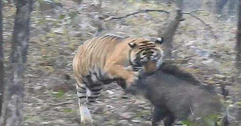 സുധാ രാമന് ഐഎഫ്എസ് ആണ് വീഡിയോ പങ്കുവെച്ചത്. കാട്ടുപന്നിയെ കടിച്ചുപിടിച്ചുനില്ക്കുകയാണ് കടുവ. തലയിലാണ് കടുവ പിടിത്തമിട്ടിരിക്കുന്നത്. എന്നാല് തോല്ക്കാന് സമ്മതമില്ലാതെ കാട്ടുപന്നി കടുവയോട് ധീരമായി പോരാടുന്നതാണ് വീഡിയോയുടെ ഉള്ളടക്കം. കാട്ടുപന്നിയുടെ ചെറുത്തുനില്പ്പില് കടുവ പിന്നാക്കം പോകുന്നത് വീഡിയോയില് വ്യക്തമാണ്.