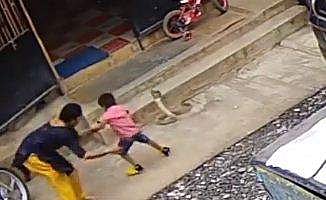 വീടിന്റെ പടിക്കെട്ടിന് തൊട്ടുതാഴെ നിലത്തായിരുന്നു പാമ്പ് ഉണ്ടായിരുന്നത്. ഇതറിയാതെ കുട്ടി പുറത്തേക്കിറങ്ങുമ്പോൾ പാമ്പ് പടികെട്ടിനോട് ചേർന്ന് മുന്നോട്ടു നീങ്ങുന്നത് വീഡിയോയിൽ കാണാം. കാല്‍പെരുമാറ്റം കേട്ടതോടെ പാമ്പ് പെട്ടെന്ന് പിന്നിലേക്ക് ചുരുണ്ട് കുട്ടിയെ ആക്രമിക്കാനായി പത്തി വിടർത്തി നിന്നു.