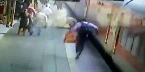 കാല്‍ തെറ്റി സ്ത്രീ ഓടുന്ന ട്രെയിനിന് അടിയിലേക്ക്; രക്ഷകനായി പൊലീസുകാരന്‍ ( വീഡിയോ)