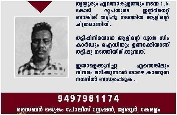 കൊച്ചി: എറണാകുളത്തും തൃശൂരുമായി 1.5കോടിയുടെ ഇന്റര്നെറ്റ് ബാങ്കിങ് തട്ടിപ്പ് നടത്തി മുങ്ങിയ ആളിന്റെ ചിത്രം പുറത്തുവിട്ട് പൊലീസ്. തട്ടിപ്പിന് ഇരയായ ആളുകളുടെ വ്യാജ സിം കാര്ഡും ഐഡിയും ഉണ്ടാക്കിയാണ് ഇയാള് പണം തട്ടിയത്.