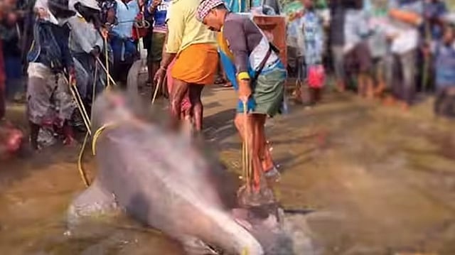 അതിരാവിലെ കടലില് പോയ വള്ളക്കാര് എറിഞ്ഞ വലിയ ചൂണ്ടക്കൊളുത്തില് ഉച്ചയോടെയാണ് സ്രാവ് കുരുങ്ങിയത്. വള്ളത്തിലുണ്ടായിരുന്ന അഞ്ച് പേര് ചേര്ന്ന് ഇറക്കാന് ശ്രമിച്ചെങ്കിലും നടക്കാതെ വന്നതോടെ തീരത്തുണ്ടായിരുന്ന മറ്റ് മത്സ്യത്തൊഴിലാളികളും ചേര്ന്നാണ് വള്ളത്തില് നിന്നും സ്രാവിനെ കരയിലേക്കെത്തിക്കാനായത്.