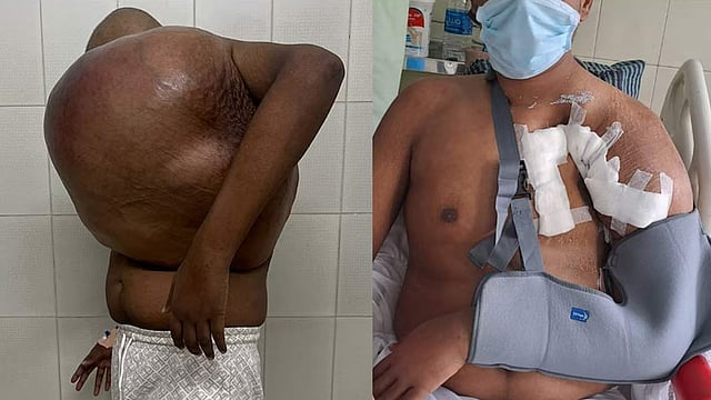 പല ആശുപത്രികളിലും പോയെങ്കിലും ജീവന് ഭീഷണിയുള്ളതിനാൽ ട്യൂമർ നീക്കാൻ പലരും തയ്യാറായില്ല. തുടർന്നാണ് കോട്ടയം മെഡിക്കൽ കോളജ് ആശുപത്രി സൂപ്രണ്ട് ഡോ. ടി.കെ.ജയകുമാറിനെ കാണുന്നത്. വളരെയധികം അപകട സാധ്യതയുണ്ടെങ്കിലും അതേറ്റെടുത്ത് ശസ്ത്രക്രിയ ചെയ്യാന് തീരുമാനിക്കുകയായിരുന്നു. 25നാണ് 12 മണിക്കൂർ നീണ്ടു ശസ്ത്രക്രിയ നടത്തിയത്. 20 ലീറ്റർ ദ്രാവകവും 23 കിലോ മാംസവുമുള്ള ട്യൂമറാണ് യുവാവിന്റെ ശരീരത്തിൽ നിന്ന് നീക്കിയത്. ഇതോടൊപ്പം ട്യൂമർ ബാധിച്ച ഇടതു ശ്വാസകോശവും നീക്കം ചെയ്യേണ്ടിവന്നു.