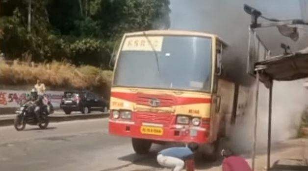 രാവിലെ പതിനൊന്നരയോടെയാണ് സംഭവം. തീ ഉയരുന്നത് കണ്ട് ഡ്രൈവര്‍ ബസ് സൈഡാക്കിയ ശേഷം ആളുകളെ ഇറക്കി. വിവരം അറിഞ്ഞെത്തിയ ഫയര്‍ഫോഴ്‌സും നാട്ടുകാരും യാത്രക്കാരും ചേര്‍ന്ന് തീയണച്ചു. ആര്‍ക്കും പരിക്കില്ല.