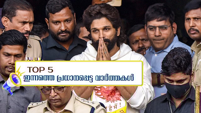 പുഷ്പ 2 പ്രീമിയർ അപകടത്തിൽ യുവതി മരിച്ച കേസിൽ അറസ്റ്റിലായ നടൻ അല്ലു അർജുൻ ജയിൽ മോചിതനായി. ഒരു ദിവസം ജയിലിൽ കഴിഞ്ഞ ശേഷമാണ് താരം മോചിതനായത്. അതിനിടെ പാലക്കാട് പനയമ്പാടം അപകടത്തിൽ സംയുക്ത പരിശോധന ഇന്ന് നടക്കും. കൂടാതെ മരിച്ച വിദ്യാർഥികളുടെ വീട്ടിൽ ഗതാഗത മന്ത്രി സന്ദർശിക്കും. ഇന്നത്തെ അഞ്ച് പ്രധാന വാർത്തകൾ.