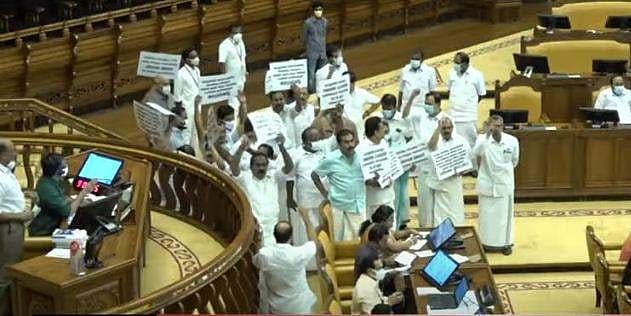 ഇതിനിടെ ബഹളം രൂക്ഷമായി. പ്ലക്കാര്ഡുകളും ബാനറുമായി നടുത്തളത്തിലിറങ്ങി പ്രതിപക്ഷം മുദ്രാവാക്യം വിളിച്ച് പ്രതിഷേധിച്ചു. ഇത്തരമൊരു സാഹചര്യത്തില് നിയമസഭാ നടപടികളുമായി സഹകരിക്കാനാവില്ലെന്നും പ്രതിപക്ഷം സഭ ബഹിഷ്കരിക്കുകയാണെന്നും വി ഡി സതീശന് പറഞ്ഞു. സഭ ബഹിഷ്കരിച്ച ശേഷം ബഹളം വെക്കുന്നത് ശരിയല്ലെന്ന് സ്പീക്കര് പറഞ്ഞു.