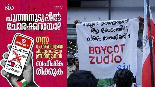 പെരുന്നാള് ഉള്പ്പെടെയുള്ള ആഘോഷങ്ങളുടെ പശ്ചാത്തത്തില് പുതു വസ്ത്രങ്ങളെടുക്കുമ്പോള് സാറ, ടാറ്റ, സൂഡിയോ തുടങ്ങിയ ആഗോള ബ്രാന്റുകളെ ഒഴിവാക്കാനാണ് ആഹ്വാനം. ഇസ്രയേല് സഹകരണം ചൂണ്ടിക്കാട്ടി കോഴിക്കോടുള്ള സൂഡിയോ ഔട്ട്ലറ്റിലേക്ക് എസ്ഐഒ കഴിഞ്ഞ ദിവസം ബഹിഷ്കരണ മാര്ച്ചും സംഘടിപ്പിച്ചിരിരുന്നു. കോഴിക്കോട് ജില്ലാ കമ്മിറ്റിയുടെ നേതൃത്വത്തില് ആയിരുന്നു മാര്ച്ച്.