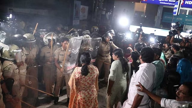 പ്രവര്ത്തകര് തീപ്പന്തം എറിഞ്ഞുവെന്നും കൈകൊണ്ട് തടഞ്ഞില്ലായിരുന്നുവെങ്കില് മരണം വരെ സംഭവിക്കാമായിരുന്നുവെന്നുമാണ് എഫ്ഐആറില് പറയുന്നത്. ജലപീരങ്കി പ്രയോഗിച്ചിട്ടും പിരിഞ്ഞുപോകാതിരുന്ന പ്രവർത്തകർ പൊലീസിന് നേർക്ക് തീപ്പന്തം എറിയുകയും ചെയ്തു. തുടർന്ന് ലാത്തിച്ചാർജ് നടത്തിയാണ് പ്രതിഷേധക്കാരെ നീക്കിയത്.