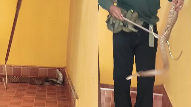 തിങ്കളാഴ്ച്ച ഉച്ചയ്ക്ക് പന്ത്രണ്ടരയോടെയാണ് സംഭവം. സ്ത്രീയും കുട്ടികളുമുണ്ടായിരുന്ന വീട്ടിലെ കോണിപ്പടിയിലെ പ്ലാറ്റ്ഫോമില് മൂര്ഖന് പതുങ്ങി ചുരുണ്ടു കൂടുകയായിരുന്നു. തലനാരിഴയ്ക്കാണ് വീട്ടുകാര് കടിയേല്ക്കാതെ രക്ഷപ്പെട്ടത്.