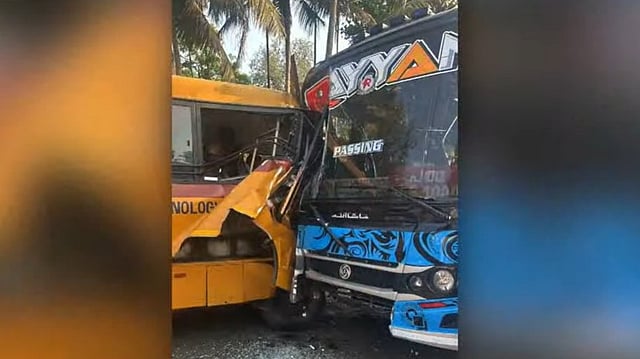 എറണാകുളം- ആലുവ റൂട്ടില് ഓടുന്ന റെയാന് ബസ് ആണ് അപകടത്തില്പ്പെട്ടത്. പെരുമ്പാവൂര് അറയ്ക്കപ്പടിയിലെ ജയ്ഭാരത് കോളജിന്റെ ബസുമായിട്ടാണ് കൂട്ടിയിടിച്ചത്.