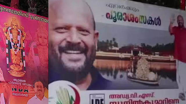 തൃശൂര്: ആറ്റിങ്ങലില് തെരഞ്ഞെടുപ്പ് പ്രചാരണ ഫ്ലക്സില് വിഗ്രഹത്തിന്റെ ചിത്രം ഉള്പ്പെടുത്തിയതില് ബിജെപി സ്ഥാനാര്ഥി വി മുരളീധരനെതിരെ തെരഞ്ഞെടുപ്പ് കമ്മീഷനില് പരാതി വന്നതിന് പിന്നാലെ തൃശൂരും സമാന സംഭവം. ഇടത് സ്ഥാനാര്ഥി വിഎസ് സുനില് കുമാറിനെതിരെയാണ് പരാതി.