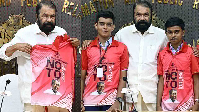 'പഠനമാണ് ലഹരി - നോ ടു ഡ്രഗ്സ്' എന്നെഴുതിയതിന് താഴെയാണ് മുഖ്യമന്ത്രിയുടെ ചിത്രം ഉള്പ്പെടുത്തിയിരിക്കുന്നത്. വിദ്യാഭ്യാസ മന്ത്രി വി ശിവന്കുട്ടി കൈമാറിയ ചുവപ്പ് ടീ ഷര്ട്ടിലാണ് മുഖ്യമന്ത്രിയുടെ ചിരിക്കുന്ന ചിത്രം ആലേഖനം ചെയ്തിട്ടുള്ളത്.