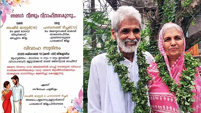പാലക്കാട്: അമ്പത്തിയഞ്ച് വർഷത്തെ ദാമ്പത്യ ജീവിതത്തിനു ശേഷം ബഷീർ മാഷും ഹസീന ടീച്ചറും വീണ്ടും വിവാഹിതരായി. മണ്ണാർക്കാട് സബ് രജിസ്ട്രാർ ഓഫീസിൽ നടന്ന ലളിതമായ ചടങ്ങിനു സാക്ഷിയായത് സുഹൃത്തുക്കളും.
