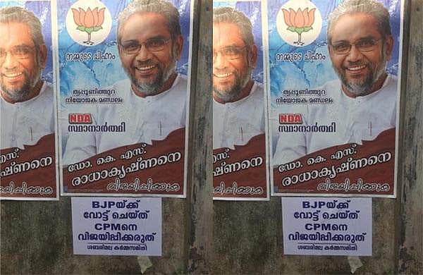 മണ്ഡലത്തില് പല പ്രദേശത്തും ഇത്തരം പോസ്റ്റര് പതിച്ചിട്ടുണ്ട്. ശബരിമല കര്മ സമിതിയുടെ കൂടെ നേതാവ് ആയിരുന്ന ഡോ. കെഎസ് രാധാകൃഷ്ണനാണ് മണ്ഡലത്തില് ബിജെപി സ്ഥാനാര്ഥി.