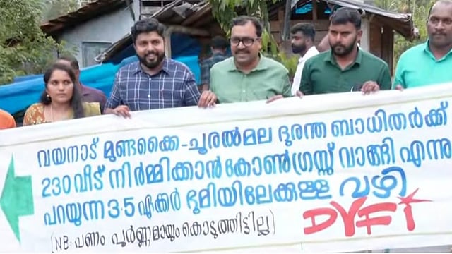 കല്പ്പറ്റ: മുണ്ടക്കൈ - ചൂരല്മല ഉരുള്പൊട്ടല് ദുരിതബാധിതര്ക്ക് വീടുകള് നിര്മിക്കുന്നതിനായി കോണ്ഗ്രസ് ഏറ്റെടുത്ത കുന്നമ്പറ്റയിലെ ഭൂമിക്ക് മുന്നില് ഡിവൈഎഫ് ഐ പ്രതിഷേധം. ഭൂമിയിലേക്കുള്ള വഴിയില് ഡിവൈഎഫ്ഐ. ബോര്ഡ് സ്ഥാപിച്ചു. വയനാട് മുണ്ടക്കൈ ചൂരല്മല ദുരന്ത ബാധിതര്ക്ക് 230 വീട് നിര്മിക്കാന് കോണ്ഗ്രസ് വാങ്ങി എന്നു പറയുന്ന 3.5 ഏക്കര് ഭൂമിയിലേക്കുള്ള വഴി എന്നാണ് ബോര്ഡില് എഴുതിയിരിക്കുന്നത്.