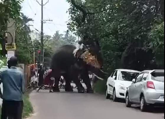 ആനയുടെ മുകളില് മൂന്ന് പേരുണ്ടായിരുന്നത്. ഇവരില് രണ്ട് പേര് ആനപ്പുറത്തുനിന്ന് താഴെവീഴുന്നത് ദൃശ്യങ്ങളില് കാണാം. ഇതില് ഒരാളെ ആശുപത്രിയില് പ്രവേശിപ്പിച്ചിട്ടുണ്ട്. ഇദ്ദേഹത്തിന്റെ കാലിന് പൊട്ടലുണ്ട്.