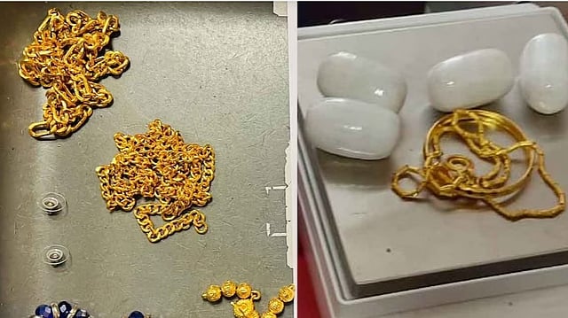 ഷാര്ജയില് നിന്നെത്തിയ മലപ്പുറം സ്വദേശിയായ മറ്റൊരു യാത്രക്കാരനില് നിന്ന് 1,182 ഗ്രാം പിടിച്ചെടുത്തു. ഇയാള് സ്വര്ണം നാലു ഗുളികകളുടെ രൂപത്തിലാക്കി ശരീരത്തിലൊളിപ്പിക്കുകയായിരുന്നു. കൂടാതെ ഇയാളില്നിന്ന് സ്വര്ണ ചെയിനും വളയും കണ്ടെടുത്തു.