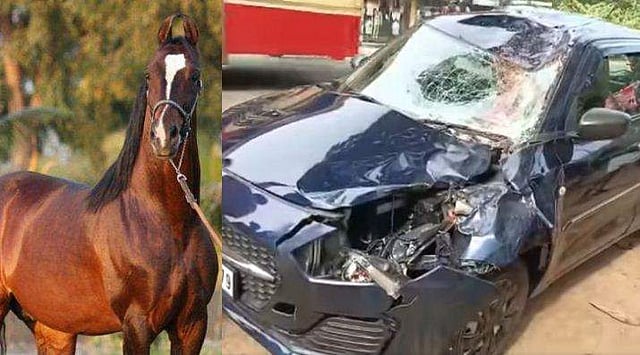 വിരണ്ടോടിയ കുതിര റോഡിലൂടെ പോയ കാറിൽ ഇടിച്ചു, ​ഗുരുതര പരുക്ക്; കാറിന്റെ മുൻഭാ​ഗം തകർന്നു