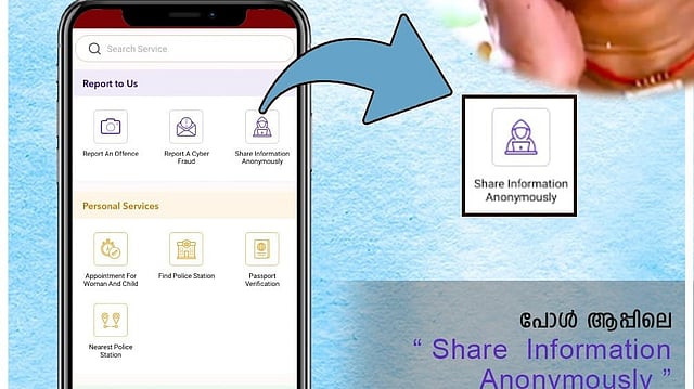 നിങ്ങള്ക്ക് എന്തെങ്കിലും കാര്യം പോലീസിനെ രഹസ്യമായി അറിയിക്കാനുണ്ടോ? പോലീസിന്റെ ഔദ്യോഗിക മൊബൈല് ആപ്പ് ആയ Pol - App ഇന്സ്റ്റാള് ചെയ്തശേഷം Share anonymously എന്ന വിഭാഗത്തിലൂടെ ഏതു വിവരവും പോലീസിനെ രഹസ്യമായി അറിയിക്കാം. നിങ്ങളുടെ വ്യക്തിവിവരങ്ങള് വെളിപ്പെടുത്തേണ്ടതില്ല.