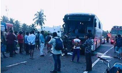 പുലർച്ചെ അഞ്ചരയോടെയാണ് അപകടം ഉണ്ടായത്. മുന്നിൽ പോകുകയായിരുന്ന ലോറിക്കു പിന്നിൽ ബസ് ഇടിക്കുകയായിരുന്നു എന്നാണ് വിവരം. ബസിലുണ്ടായിരുന്ന മറ്റു യാത്രക്കാർക്ക് ആർക്കും കാര്യമായ പരുക്കുകളില്ല. ബസിന്റെ ഡ്രൈവർ ഇരുന്ന ഭാഗം പൂർണമായും തകർന്നു. ഡ്രൈവർ ഉറങ്ങിപ്പോയതാവാം അപകടകാരണമെന്നാണ് പ്രാഥമിക നിഗമനം.