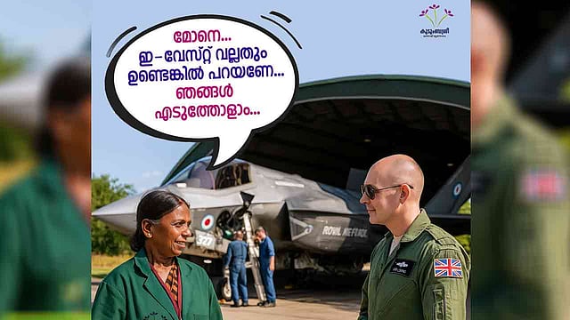 ഈ അറിയിപ്പാണ് രസകരമായ പരസ്യമായി കുടുംബശ്രീ പങ്കുവച്ചത്. തിരുനന്തപുരം വിമാനത്താവളത്തില് യന്ത്രതകരാറിനെ തുടര്ന്ന് കുടുങ്ങിയ ബ്രിട്ടീഷ് യുദ്ധവിമാനത്തിന്റെ ചുമതലക്കാരനോട് ഇ - മാലിന്യം ഉണ്ടെങ്കില് ഞങ്ങളെടുക്കാം എന്ന് പറയുന്ന ഹരിത കര്മസേനാംഗത്തെയാണ് പരസ്യത്തില് ഉള്പ്പെടുത്തിയിരിക്കുന്നത്.