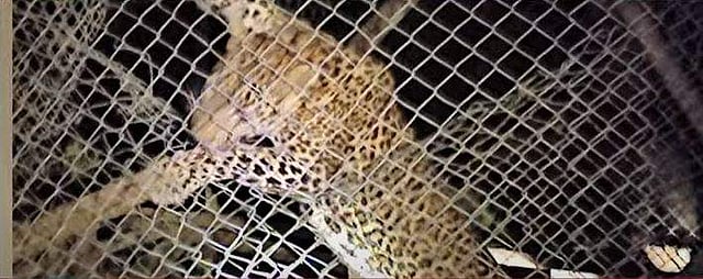 പുലി വലയില്‍ കുടുങ്ങിയ നിലയില്‍/ ടിവി ദൃശ്യം