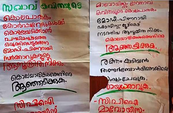 'മാവോയിസ്റ്റ് നേതാവ് കവിതയുടെ കൊലപാതകം മോദി- പിണറായി ഫാസിസ്റ്റ് കൂട്ടുകെട്ട് നടത്തിയ ആസൂത്രിത നീക്കമാണെന്നും കൊലയാളി സംഘത്തിനെതിരെ ആഞ്ഞടിക്കണമെന്നും രക്തം കുടിയന് തണ്ടര്ബോള്ട്ടിനെതിരെ സംഘം ചേരണമെന്നും' സിപിഐ മാവോയിസ്റ്റുകള് എന്ന പേരില് പതിച്ച പോസ്റ്ററില് പറയുന്നു