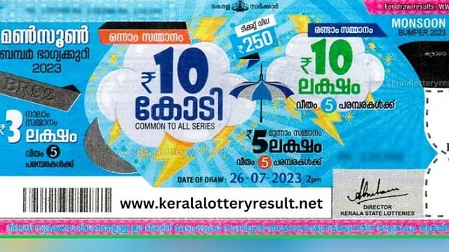 ജൂലൈ 27ന് ഉച്ചതിരിഞ്ഞ് രണ്ടു മണിയ്ക്ക് നറുക്കെടുക്കുന്ന മണ്സൂണ് ബംപറിന് 5000, 1000, 500 എന്നിങ്ങനെ 250 രൂപയില് അവസാനിക്കുന്ന സമ്മാനങ്ങളുമുണ്ട്. 250 രൂപയാണ് ടിക്കറ്റു വില.