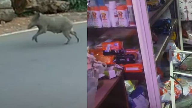 വിജയ് അക്വേറിയം എന്ന കടയില്ക്കയറിയ പന്നികള് കടയിലുള്ള അക്വേറിയം കുത്തിമറിച്ചിട്ട് നശിപ്പിച്ചു. തുടര്ന്ന് സമീപത്തെ കിങ്സ് മൊബൈല് ഷോപ്പിലും കയറി അക്രമം നടത്തി. ഷോപ്പ് ഉടമ സുധീറിനെ പന്നികള് കുത്തിപ്പരിക്കേല്പ്പിച്ചു.