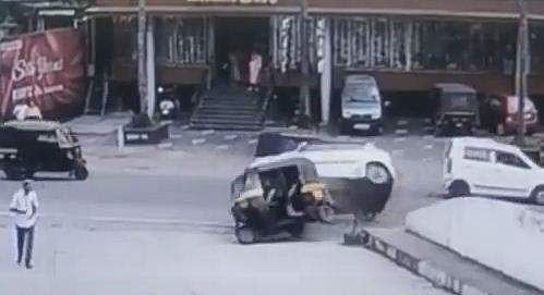 ഓട്ടോയുടെ പിന്നില്‍ കാര്‍ പാഞ്ഞുകയറി; ഇടയില്‍ അകപ്പെട്ട് കാല്‍നടയാത്രക്കാരി, അത്ഭുത രക്ഷപ്പെടല്‍