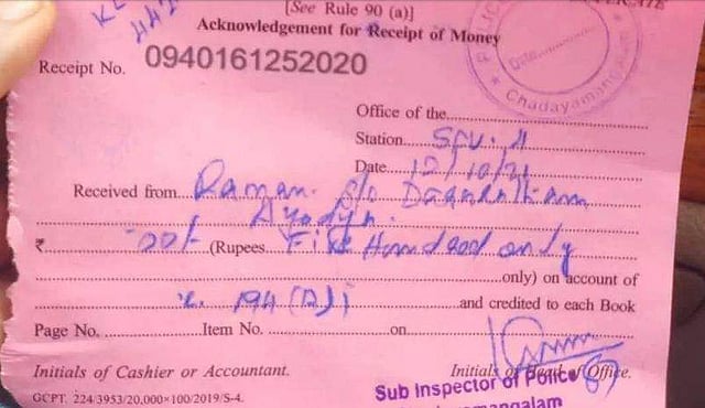 ഈ പേരും വിലാസവും വെച്ച് പൊലീസുകാര്‍ രസീത് നല്‍കി. ഈ രസീതും പൊലീസുമായി സംസാരിക്കുന്നതിന്റെ വീഡിയോയും സമൂഹമാധ്യമങ്ങളില്‍ വലിയ ചര്‍ച്ചയായിരുന്നു. ആര് എന്ത് പറഞ്ഞാലും സര്‍ക്കാരിന് കാശ് മതി എന്നാണ് പൊലീസ് ഇവരോട് പറയുന്നത്.