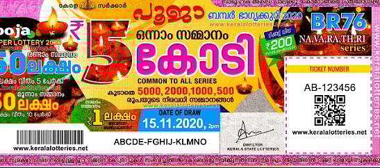 തിരുവനന്തപുരം: കേരള സംസ്ഥാന ഭാഗ്യക്കുറി വകുപ്പിന്റെ പൂജ ബമ്പർ (BR 76) ലോട്ടറി നറുക്കെടുപ്പ് നാളെ. നവംബർ 15ന് രണ്ട് മണിയ്ക്ക് പൂജ ബമ്പർ നറുക്കെടുപ്പ് നടക്കും. സെപ്റ്റംബർ 22നായിരുന്നു ടിക്കറ്റ് വിൽപ്പന ആരംഭിച്ചത്. ഇന്നലെ വരെ 30 ലക്ഷത്തിലേറെ ടിക്കറ്റുകളാണ് വിറ്റുപോയത്.