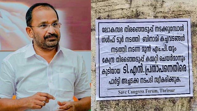 ലോക്സഭ തെരഞ്ഞെടുപ്പ് നടക്കുമ്പോള് ഗള്ഫ് ടൂര് നടത്തി ബിനാമി കച്ചവടങ്ങള് നടത്തി നടന്ന മുന് എംപിയും കേന്ദ്ര തെരഞ്ഞെടുപ്പ് കമ്മിറ്റി ചെയര്മാനും കൂടിയായ ടി എന് പ്രതാപനെതിരെ പാര്ട്ടി അച്ചടക്ക നടപടി സ്വീകരിക്കുക എന്നാണ് പോസ്റ്ററില് ആവശ്യപ്പെട്ടിട്ടുള്ളത്. സേവ് കോണ്ഗ്രസ് ഫോറം തൃശൂര് എന്ന പേരിലാണ് പോസ്റ്ററുകള്.