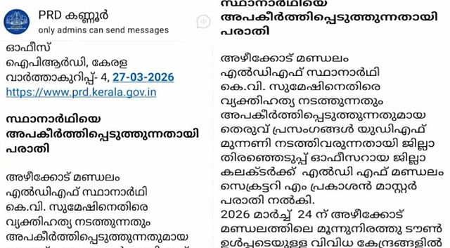 സംഭവം വിവാദമായതോടെ തെരഞ്ഞെടുപ്പ് കമ്മീഷന് വിഷയത്തില് ഇടപെട്ടു. വിഷയത്തില് മുഖ്യതെരഞ്ഞെടുപ്പ് ഓഫീസര് കലക്ടറോടറോട് റിപ്പോര്ട്ട് തേടിയിരുന്നു. ഉദ്യോഗസ്ഥന് തെരഞ്ഞെടുപ്പ് ചട്ടംലംഘിച്ചെന്ന് കണ്ടെത്തിയാണ് കലക്ടറുടെ നടപടി. അതേസമയം കലക്ടര്ക്ക് എല്ഡിഎഫ് നല്കിയ പരാതിയെക്കുറിച്ച് വാര്ത്താക്കുറിപ്പ് തയ്യാറാക്കുക മാത്രമാണ് ചെയ്തതെന്നാണ് പിആര്ഡിയുടെ വിശദീകരണം.