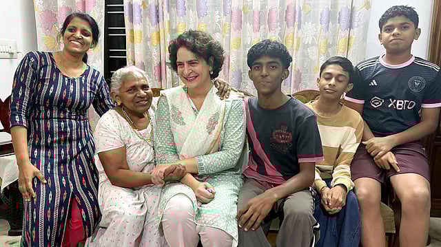 കാലിന് സുഖമില്ലാത്തതിനാല് റോഡിലേക്കിറങ്ങി വന്ന് കാണാന് ബുദ്ധിമുട്ടുള്ള കാര്യം പറഞ്ഞതോടെ എന്നാല് പിന്നെ ഇപ്പോള് തന്നെ പോകാമെന്നായി പ്രിയങ്ക. അങ്ങനെയാണ് പ്രിയങ്ക ഗാന്ധി ത്രേസ്യയെ കാണാനെത്തുന്നത്. വീട്ടിലെത്തിയ പ്രിയങ്കയെ കണ്ട് ത്രേസ്യ ശരിക്കും അമ്പരന്നു. പിന്നീട് കെട്ടിപ്പിടിച്ച് സ്നേഹം പങ്കുവെച്ചു. കൊന്തയും മധുരവും നല്കിയാണ് പ്രിയങ്കയെ സ്വീകരിച്ചത്. പതിനഞ്ച് മിനിറ്റോളം വീട്ടില് ചിലവഴിച്ച ശേഷമാണ് പ്രിയങ്ക മടങ്ങിയത്.