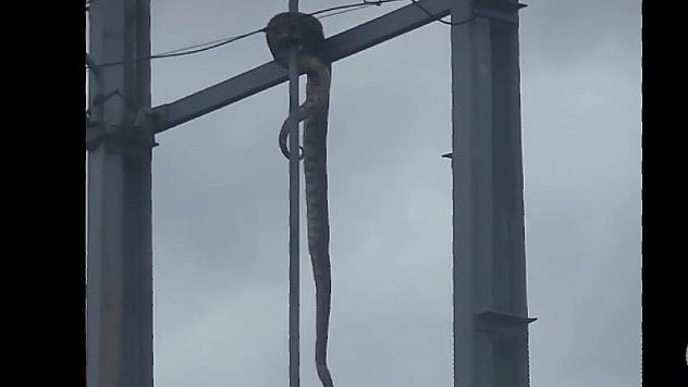 ബൈപ്പാസിലെ വൈദ്യുതി പോസ്റ്റിന് മുകളിലെ എർത്ത് കമ്പിയിൽ ചുറ്റിയ നിലയിലായിരുന്നു പെരുമ്പാമ്പ്. അവശനിലയിലായിരുന്ന പാമ്പിനെ കണ്ട് നാട്ടുകാർ വിവരം കെഎസ്ഇബി ഓഫീസിൽ അറിയിച്ചു.